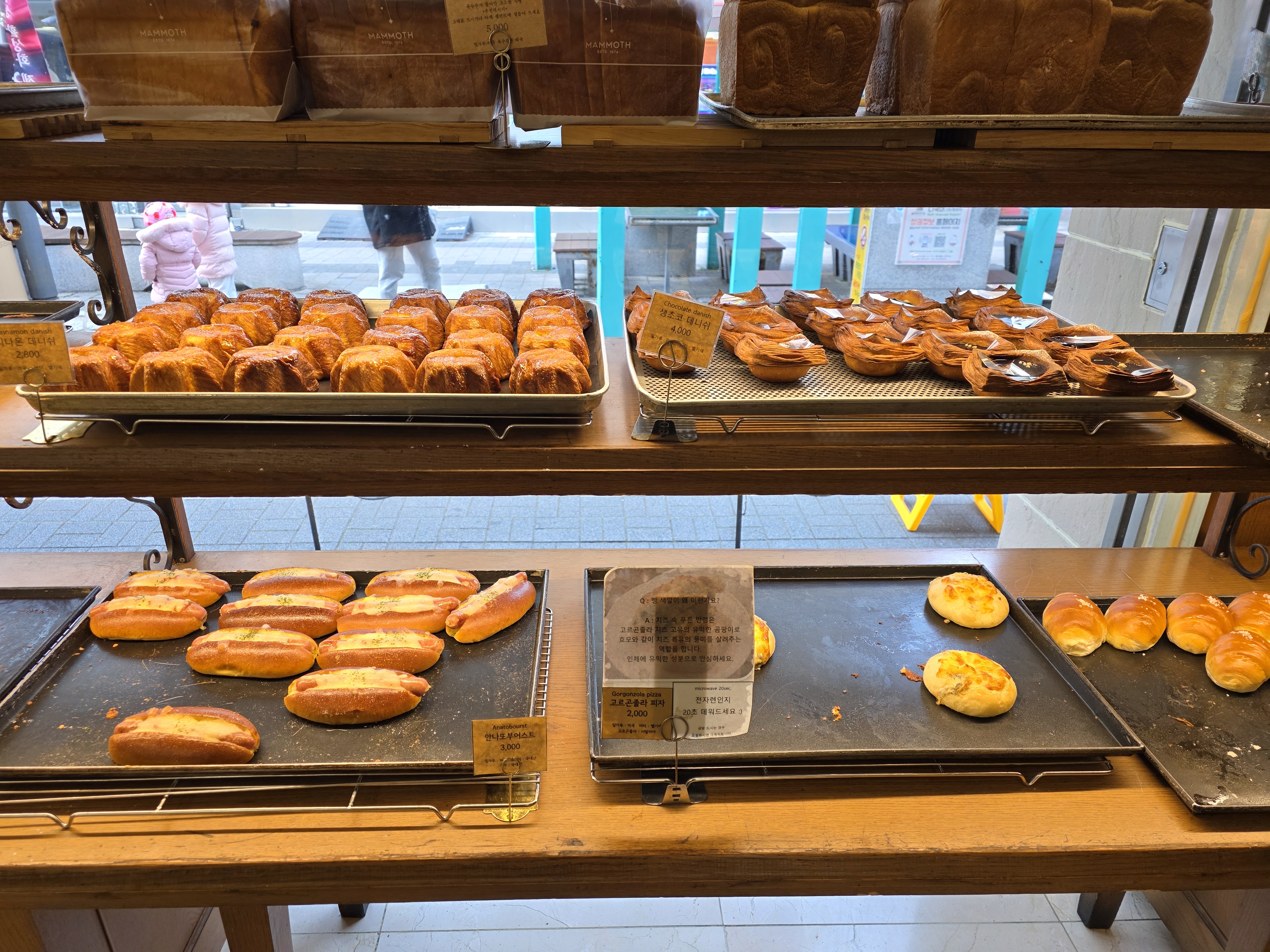 맘모스 베이커리는 유명한 크림치즈빵 외에도 정말 다양한 빵들이 있어 가족 모두의 취향을 만족시킬 수 있었습니다.